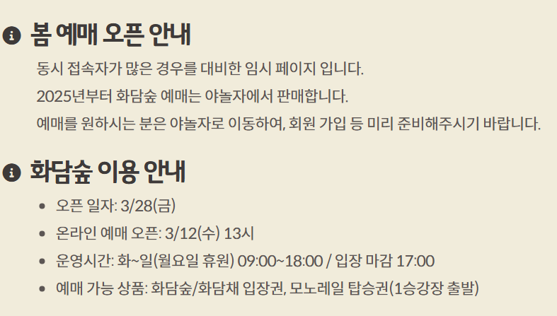 2025년부터 야놀자 플랫폼을 통한 사전 예약이 필수이며, 현장에서는 입장권을 구매할 수 없습니다. 따라서 방문을 계획하고 있다면 원하는 날짜의 예약 가능 여부를 미리 확인하고 빠르게 예매하는 것이 중요합니다. 올해 화담숲 봄 오픈은 3월 28일(금)입니다.