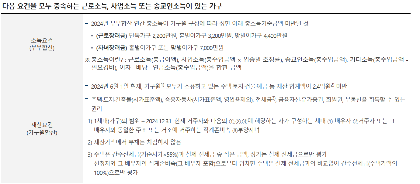 2024년 6월 1일 기준으로 가구원의 재산 합계액이 2억 4천만 원 미만이어야 합니다. 재산에는 주택, 토지, 자동차, 예금 등이 포함됩니다. 재산 합계액이 1억 7천만 원 이상 2억 4천만 원 미만일 경우에는 근로장려금의 50%만 지급됩니다.