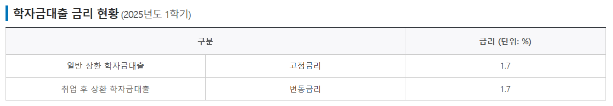 2025년도 1학기 학자금 대출 금리는 일반 상환 학자금대출은 고정금리로 1.7%이며, 취업 후 상환 학자금대출자는 변동금리로 1.7% 적용됩니다. (아래 이미지 클릭 시 자세하게 확인하실 수 있습니다)