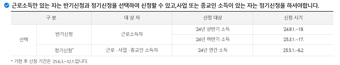 - 반기신청: 2024년 상반기 소득(2024.09.01~19) / 하반기 소득(2025.03.01~17)