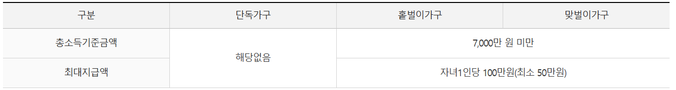 - 홑벌이 가구: 총소득 2,100만 원 이하일 경우 자녀 1인당 최대 100만 원 지급, 7,000만 원에 가까울수록 금액 감소 (최소 50만 원)