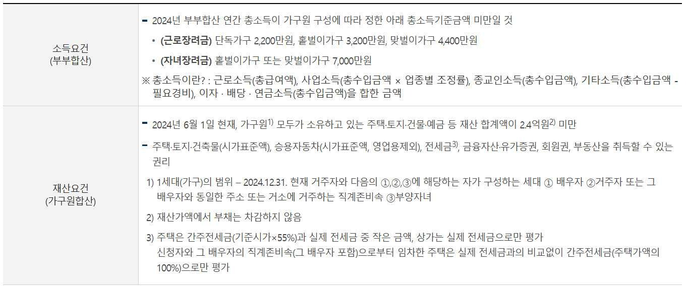 2024년 6월 1일 기준으로 가구원 전체의 재산 합계액이 2억 4,000만 원 미만이어야 합니다.