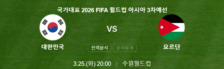2025년 3월 25일 화요일 오후 8시(한국 시간), 대한민국 축구 국가대표팀은 수원월드컵경기장에서 요르단과 2026 북중미 월드컵 아시아 지역 3차 예선 8차전을 치릅니다. 이 경기는 대한민국이 본선 진출을 확정짓기 위한 중요한 경기로, 많은 축구 팬들의 관심이 집중되고 있습니다. 경기 정보에 대해서 알아보겠습니다.