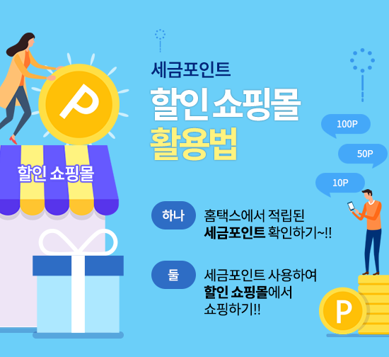 세금포인트로 할인 쇼핑몰을 활용하려면 홈택스에서 적립된 세금포인트 확ㅇ니하고, 할인 쇼핑몰에서 쇼핑하면 끝!